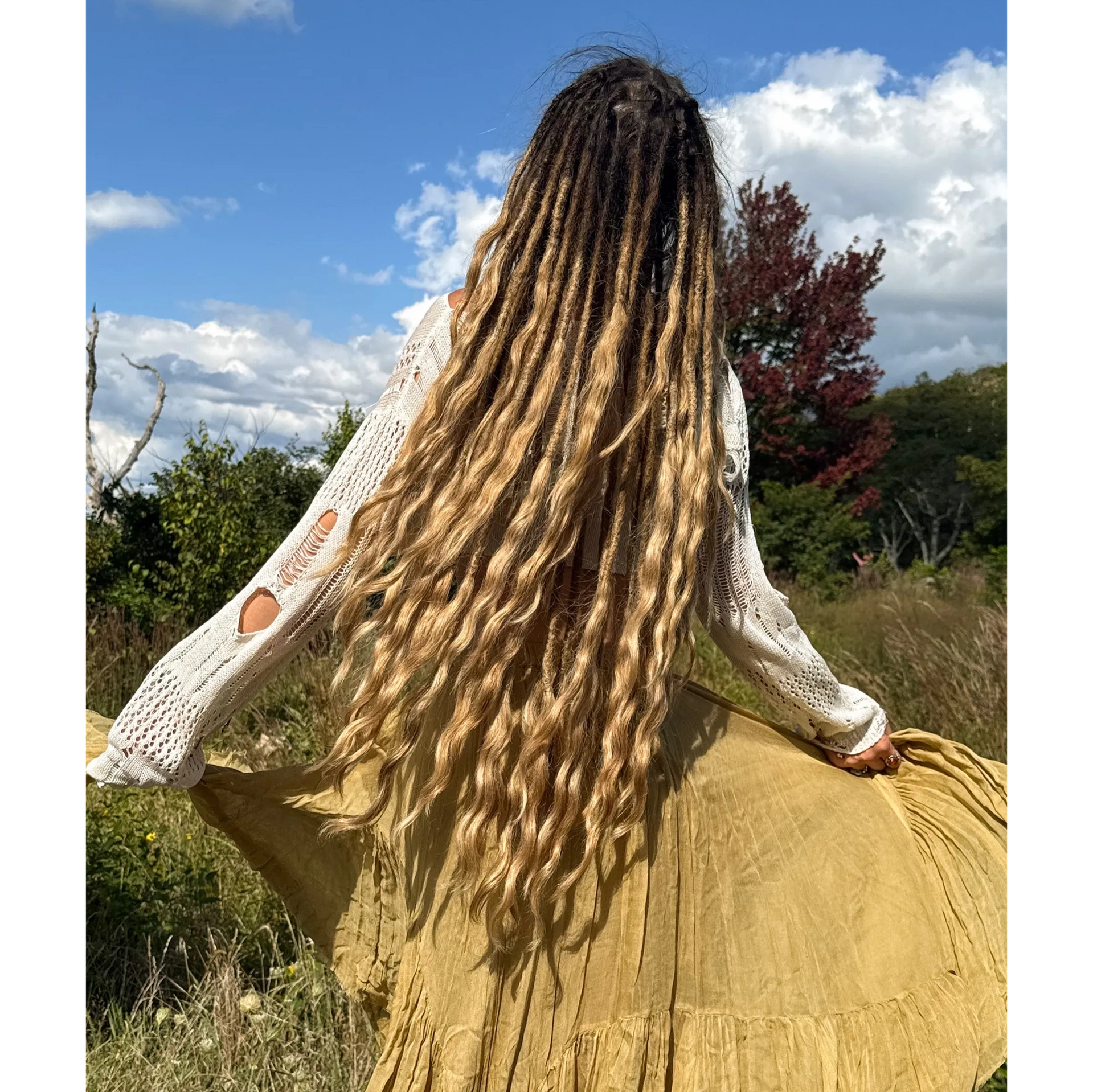 I have been working on locs since early 2020 when I started my own. In early 2023 it became my full-time career. I absolutely love this art form and helping people find themselves along this journey. I use the crochet method for creating new dreadlocks, doing maintenance, and making custom extensions.